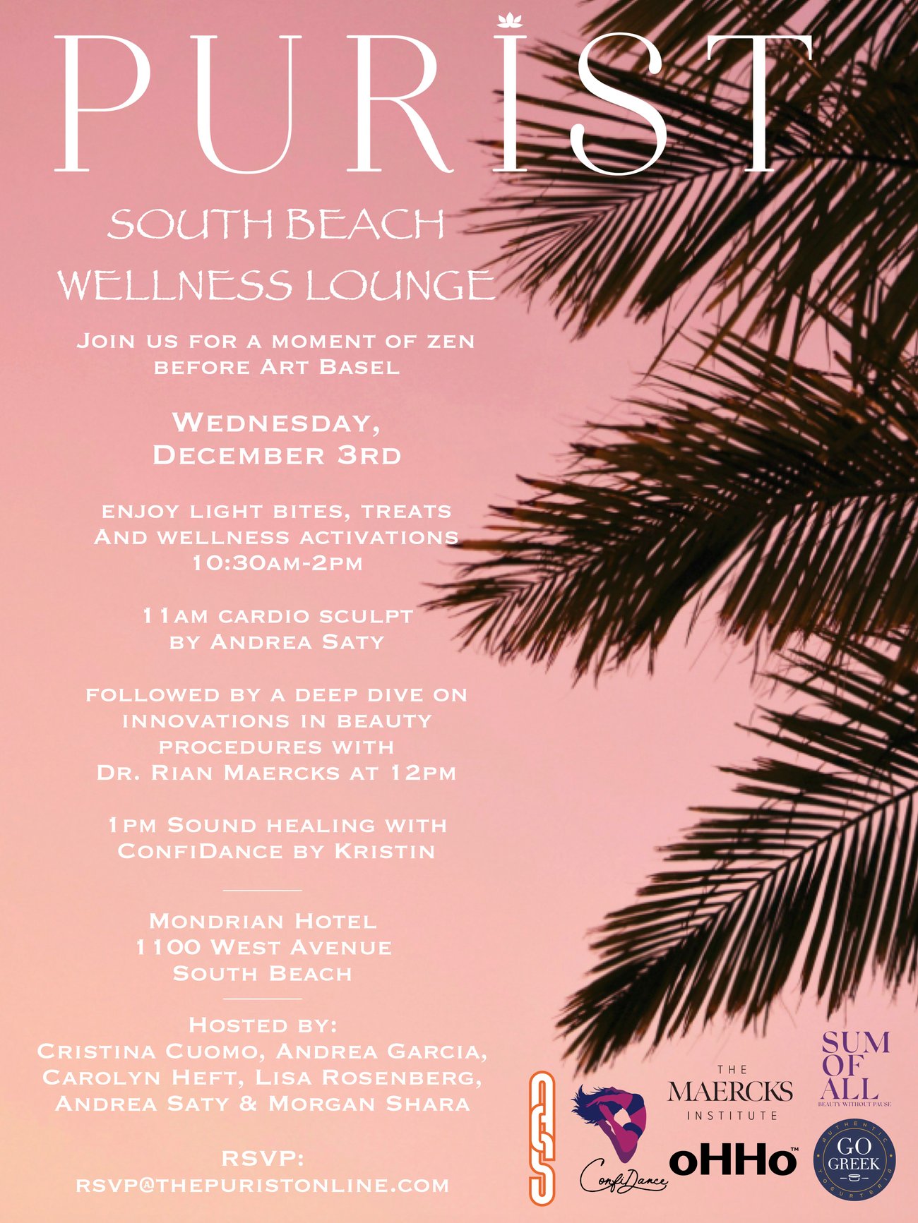 Join Purist on Wednesday, December 3, from 10:30AM–1:30PM at the Mondrian Hotel in South Beach for a special Wellness Lounge, highlighting the best in integrative well-being. RSVP to RSVP@thepuristonline.com.